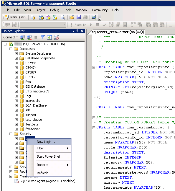 - On the Object Explorer pane, expand the Security folder, right-click Login, and then select New Login: