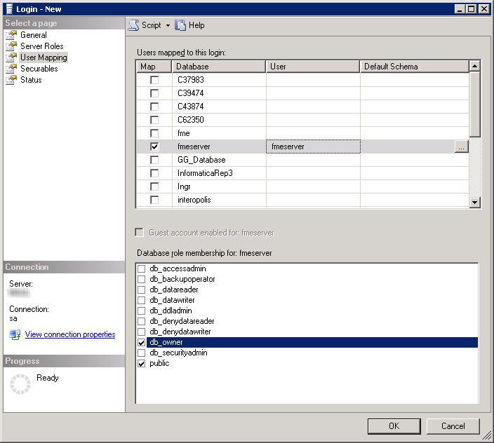 - At the Database role membership for location, notice that the fmeflow database is specified and check db_owner to assign that role to this database.