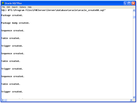 - When connected to the FME Flow database, run the oracle_createDB.sql script by entering the following command: