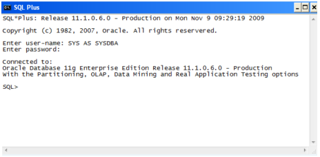 - Open Oracle SQL*Plus and log on as a user with adequate privileges, such as SYSDBA.