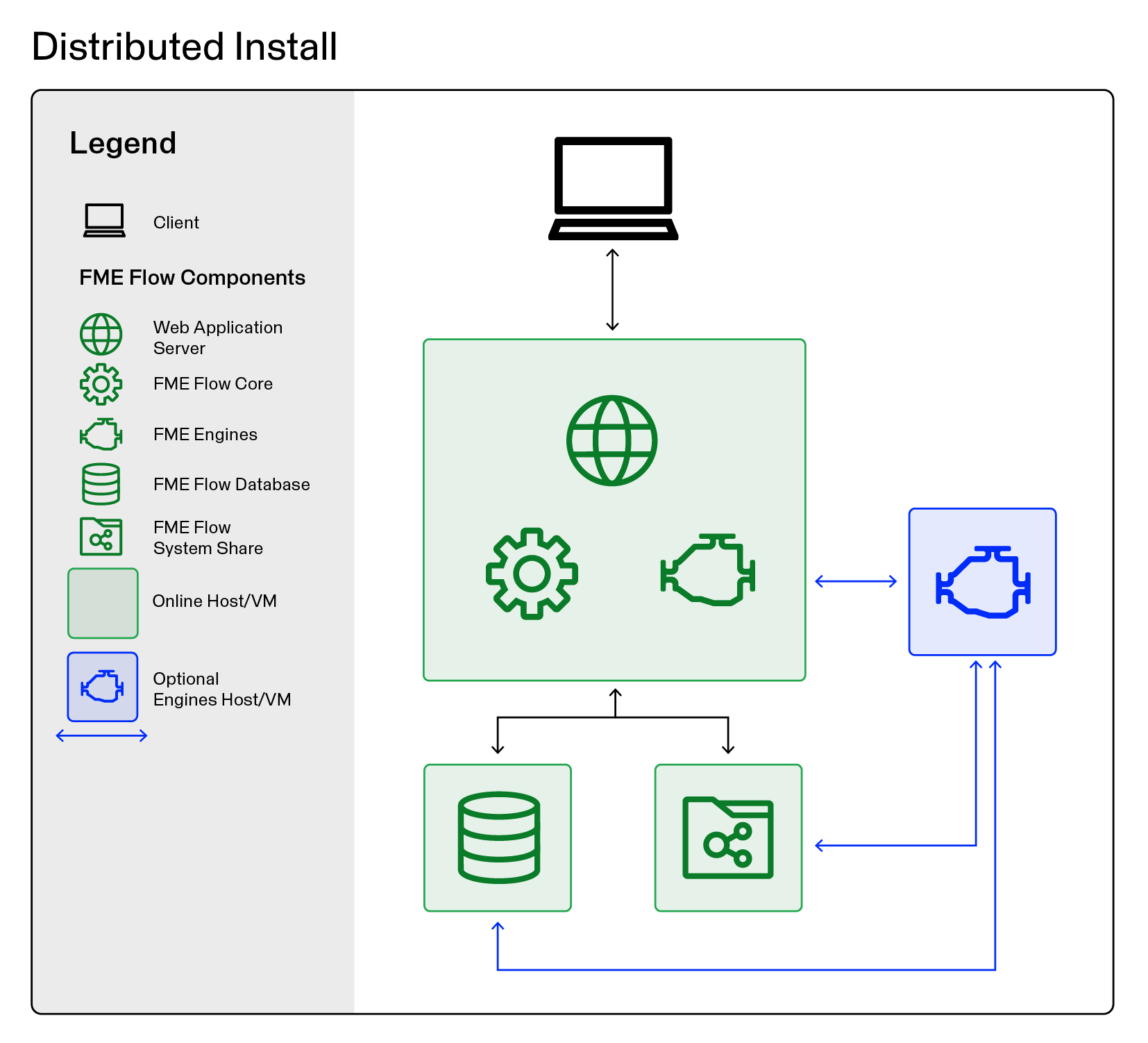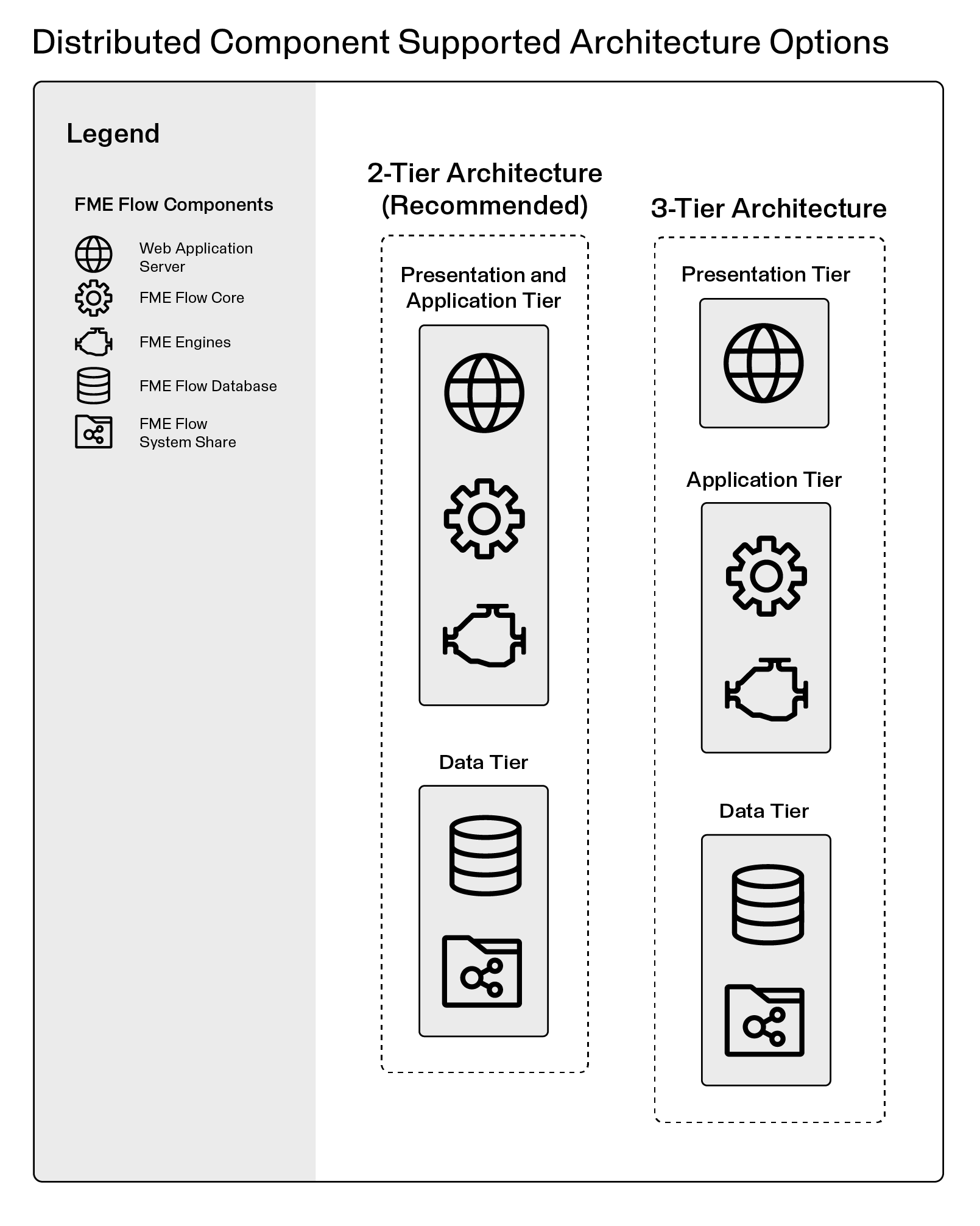 You can distribute the components of an FME Flow installation to achieve an n-tier architecture. Both 2-tier and 3-tier configurations are supported: