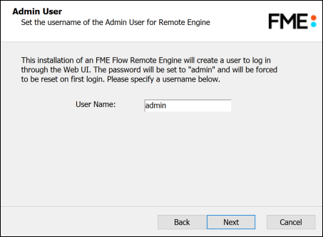 This installation of an FME Flow Remote Engine Service creates a user to log in to the FME Flow Web User Interface. To log in to the Web User Interface for the first time as an administrator following installation, enter the User Name specified below and Password admin. You will be prompted to update the password upon initial use, based on the default Password Policy configuration.