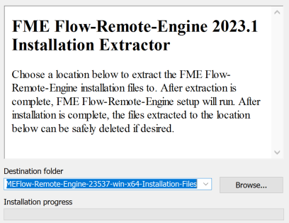 On the Installation Extractor dialog, specify a Destination folder in which to extract installation files. Note that this folder only specifies where installation files are extracted—it does not specify where FME Flow remote engine program files are installed. That location is specified later in the installer.