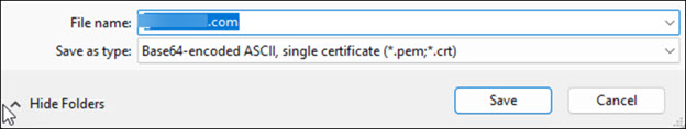 e. Save as Base-64-encoded ASCII, single certificate (CRT) to local disk (for example, <certpath>\mycert.crt)