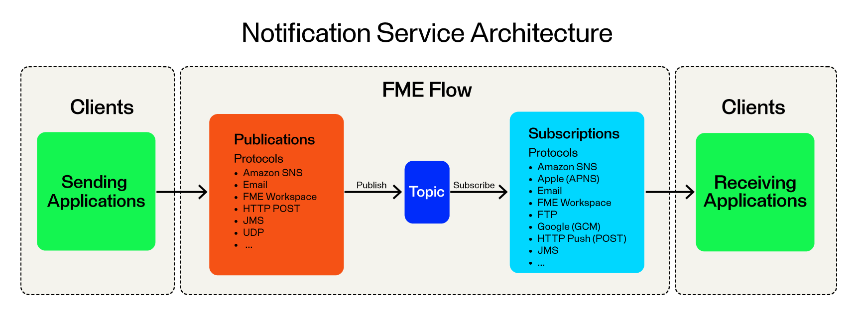 Publishers receive content from an FME Workspace, or from other clients over a supported protocol, and deliver the content as notifications to topics.