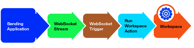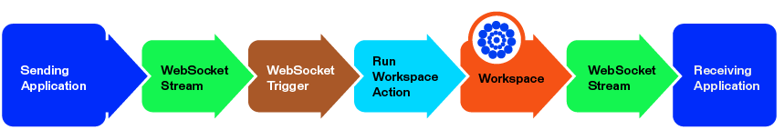 In the following example, a WebSocket trigger receives a named WebSocket stream, and sends it to a Run Workspace action, which runs an FME workspace equipped with a WebSocketConnector transformer.