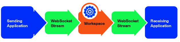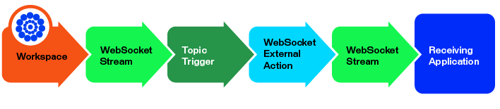 In this example, an FME workspace equipped with a WebSocketConnector transformer sends a named WebSocket stream to a FME Flow Topic trigger. A WebSocket external action receives the message stream from the topic and sends it to a WebSocket-supported client.