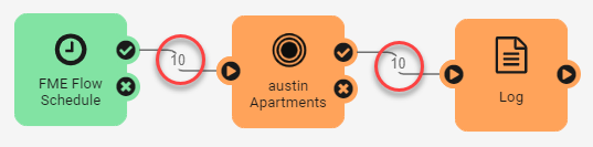 FME Flow records the number of times a node in your automation runs. Event counts are visible on connection lines. In this example, both the FME Flow Schedule trigger and the Run a Workspace action have run ten times since the automation started:
